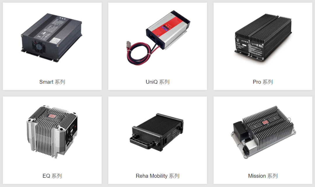 除此之外的主要標準品充電器有7大系列:Smart系列、UniQ系列、Pro系列、 EQ系列、Reha系列、Mission系列和N系列,全面覆蓋工程機械、高空作業平臺,環衛清潔車、洗地機、掃地機、AGV、機器人、輪椅、代步車、觀光車、物流叉車、園藝護理設備、農用機械、機場地勤設備等領域以電池為動力的設備和低速車的充電。