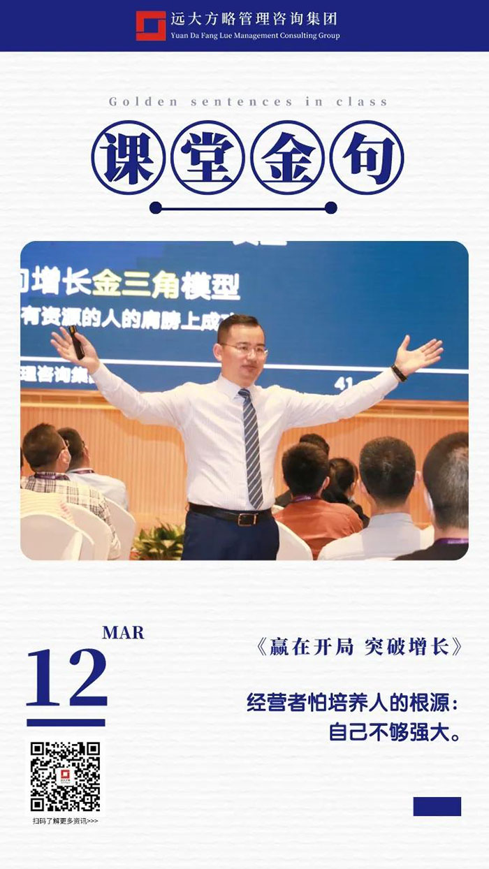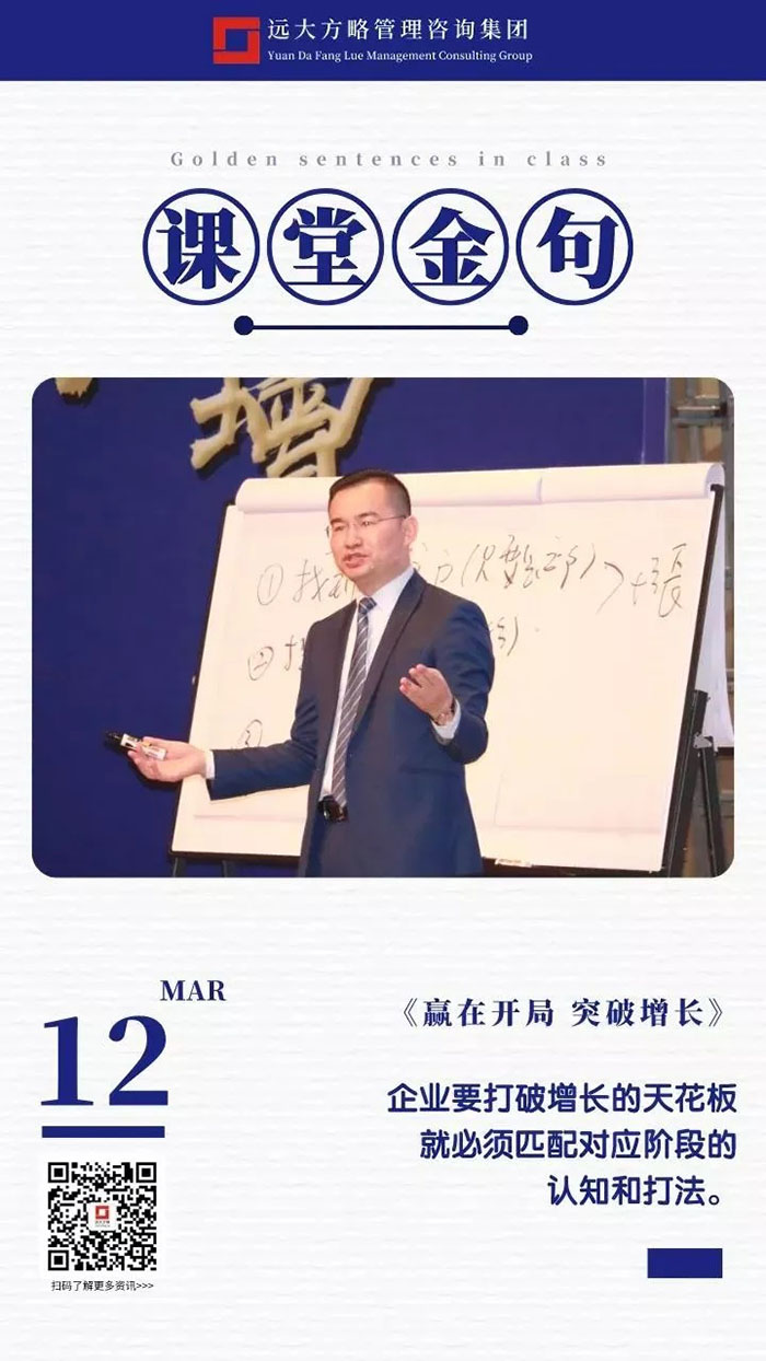 課堂上雷老師講課循序漸進,通過問題的形式逐步引發學員的思考,讓每位學員都能有所感有所悟,回到企業之后能夠落到實處,做到真正的幫企業解決問題,這也正是遠大方略的定位,成為中國實體企業實效的持續增長方案解決商,遠大方略也一直秉承初心努力踐行!