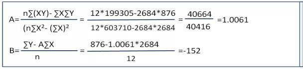 移動平均法比算術平均法先進。它是指在積累了n期銷售量的基礎之上,按照事先確定的期數m(m 預測銷售量=最后m期的平均銷售量+趨勢值 趨勢值=最后移動期的平均值-上一個移動期的平均值 實例如下: 已知:如下的銷量資料,假定銷售量的移動期m為3(季度),趨勢平均值s移動期為3,時間序列期數n為11。要求計算:按移動平均法預測2018年12月的銷售量。 解:依題意計算各期銷售量移動平均值、趨勢值和趨勢值移動平均值,其結果如下示例圖2: 最后一期平均值:(86+91+95)/3=90.67(萬元) 趨勢值=90.67-85.67=5(萬元) 所以12月份的預測營收=90.67+5=95.67(萬元) 移動平均法,既考慮了銷售量的移動平均數,又考慮了趨勢值的移動平均數,邏輯清晰。除移動平均法以外,我們常用的還有加權平均法,加權法相對比較簡單,但有時我們也會加權平均法組合成加權移動平均法。 我們再來看另外一種運用廣泛因果關系的預測分析方法,即線性回歸分析法。 2.線性回歸分析法: 線性回歸分析法也稱二元一次直線分析法,它的模型是Y=AX+B,數學有一定基礎的知道,也就是這類二元一次線性直線。我們先以一個例子假以說明,如下示例圖3: 要求: 用回歸直線分析法建立A產品的營收預測模型; 預測2019年1月份A產品的營收額; 第一步進行調表格調整,如下示例圖4: ▲示例圖4 則線性相關系數R約為1,表明X與Y之間是正相關,符合線性回歸性。如下 示例圖5: 依據公式線性公式可得出A與B的取值,如下示例圖6: 所以:Y=AX+B=1.0061X-152 2019年1月份總營收當255時,則A產品的營收約為:1.0061*255-152=104.5(萬元) 或許有人會說這個計算的過程相對較為復雜,有沒有相對更簡單的方法?答案是肯定的。在EXCEL函數中,FORECAST回歸預測法,正是上面推導的一個應用工具函數。具體使用方法如下示例圖7,計算出結果是104.2萬元;其結果與上面計算得出的104.5兩者的吻合度99.97%,是非常高的。 ▲示例圖7 二、修正預測數據 在實際的管理中,因為特殊的節點等因素,部分數據會異常突變,我們可稱之這異常數據,在做數據分析時,我們為避免異常數據平均化,須提前把那一類的數據單獨加工處理。 1.異常節點維度 (1) 特殊時期(春節、國慶、雙11、黑色星期五等)活動的趨勢; (2) NPI(新產品導入)快速切入要求; (3) 滯銷或呆滯的要求; (4) ECN(工程切換)要求; (5) MPQ(較小包裝量)、MOQ(較小訂單量)等原因; (6) 增量幅度; (7) 重大品質客訴; 2.預測期數 銷售預測時,為避免數據短期波動,我們在取數時應考慮的期數盡量要長。 (1) 做年度預測,建議取近2年整年度的數據,即N=24; (2) 做季度預測,建議取近12個月年數據,即N=12; (3) 做月度預測,建議取近6個月年數據。即N=6; 實際的管理中,無論是銷售管理還是庫存管理,要做到精細化預測其難度遠不僅限以上要求。還有許許多多的無法控制的外在因素,比如:大的經濟環境、同行競爭、競爭品等。只有我們熟練地掌握預測的工具并科學加以運用,同時結合適度提前考慮等外在因素可能會造成的影響,唯有這樣,我們的預測才能做到貼合于實際,也才會更精準。