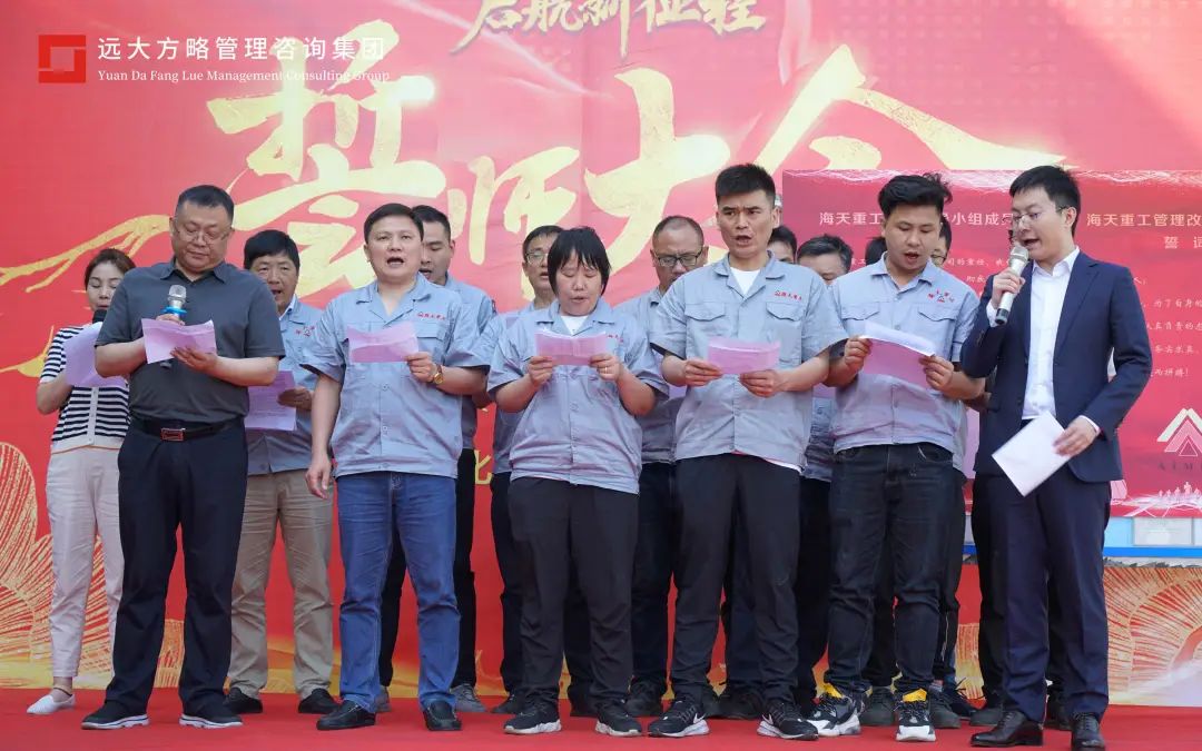 任正非說,產(chǎn)品發(fā)展的路標(biāo)是客戶需求導(dǎo)向,企業(yè)管理的目標(biāo)是流程型組織建設(shè)。此次變革就是增強組織能力,提高企業(yè)的管理水平和競爭力,支撐公司戰(zhàn)略目標(biāo)的實現(xiàn)。針對變革,老師有方法和工具,但是需要大家一起攜手將方案有效落地,推動此次變革的順利進(jìn)行。會上遠(yuǎn)大方略項目組老師也上臺進(jìn)行了宣誓,必將全力以赴做好此次海天重工的項目改善,助力企業(yè)更成功。