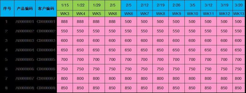 不同企業選擇也不盡相同,客戶需求穩定一般所采用的是前兩者;一份Shipping plan報表,一般前面幾周是正式PO訂單模式,后面數周是FORECAST需求模式;以下是簡易版SHIPPING PLAN,如截圖2: