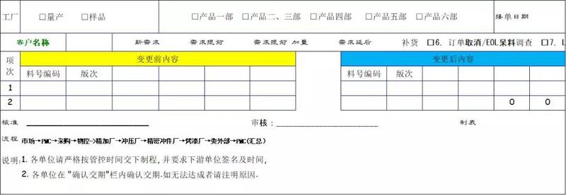 需求并非一成不變的,當需求變更時,則需對所變更的內容發布相應的《訂單變更通知單》,訂單變更通知單變更內容需要注意以下要素: