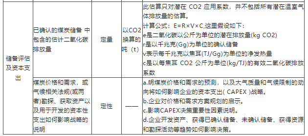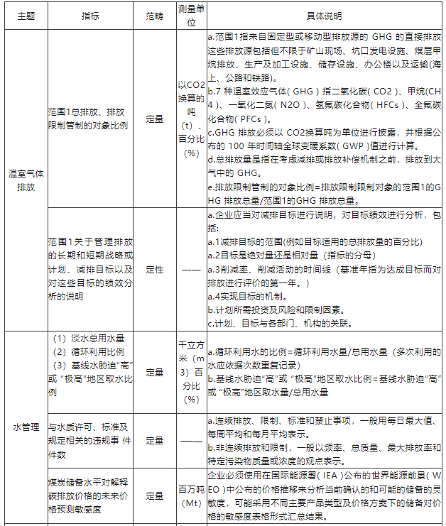 煤炭作業產業包括開采煤炭的企業和制造煤炭產品的企業,開采活動分為地下開采和露天開采,開采對象分為普通煤和原料煤。煤炭行業屬于資源密集型,作業過程直接產生較多溫室氣體。該準則要求相關企業在溫室效應煤煙排放方面對溫室氣體排放量進行直接披露,并對企業短期、長期的減排計劃與目標按要求進行信息披露。對水資源的管理主要側重于對水的循環利用、合規利用方面的披露。儲備評估及資本支出方面側重于對煤炭產業未來氣候相關影響的預測。此外,針對煤炭行業的開采對象,該準則還要求對普通煤生產量(百萬噸)和原料煤生產量(百萬噸)進行披露。