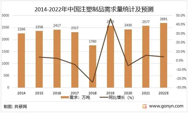 2014-2022年中國(guó)注塑制品需求量統(tǒng)計(jì)及預(yù)測(cè)