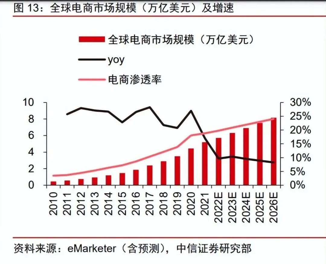 疫后消費線上化趨勢延續,2026 年全球電商滲透率有望達 24%。疫情加速培育全球用戶電商消費習慣,根據 eMarketer,全球電商市場規模 2019-2021 年 CAGR 為 22%。盡管全球疫情已進入常態化防控階段,但消費者線上購物的習慣仍然得以保持,根據相關數據顯示,疫情后依然會偏好線上購物的用戶數在不同品類提升 5%-15%。消費線上化趨勢下,根據 eMarketer,預計 2026 年全球電商市場規模有望達 8.1 萬億美元,2022-2026 年 CAGR 為 9%,2026 年全球電商滲透率有望達 24%。