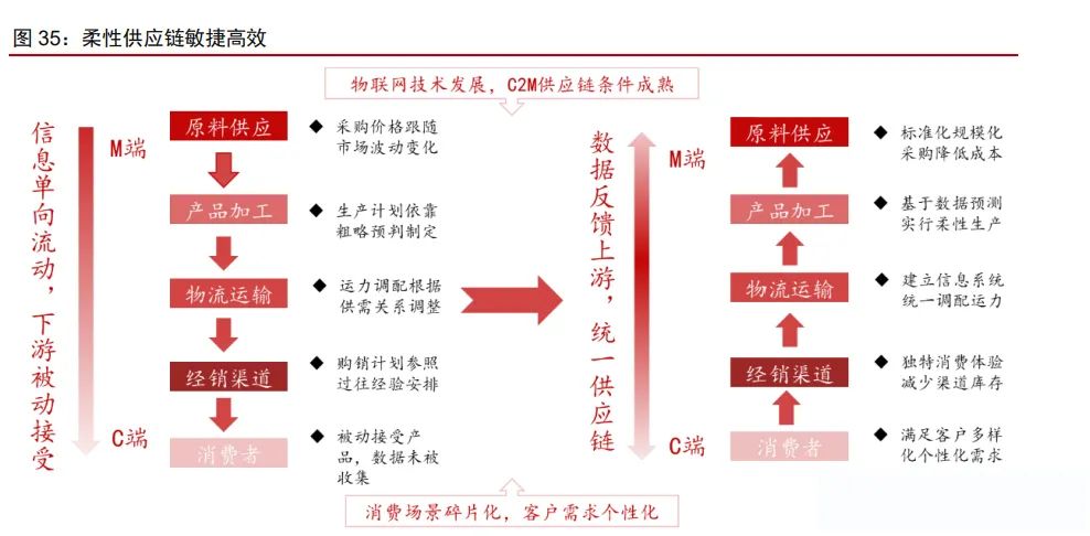 柔性供應鏈高度敏捷,更快捕捉趨勢性機會。中國供應鏈高度靈活敏捷,對傳統供應 鏈的數字化賦能、消費者數據的沉淀以及逆向反饋使得工廠具有按需生產的能力,大幅降 低商家庫存和成本壓力,“小單快反”的模式也能幫助商家更快地捕捉趨勢性機會。以柔性供應鏈的極致踐行者 Shein 為例,根據 Zara 財報及晚點 LatePost,Shein 從收到訂單 到產品出廠/庫存周轉天數只需 5/30 天,生產及周轉效率明顯高于 Zara、H&M,而生產成 本僅為 Zara 的 30%-50%。