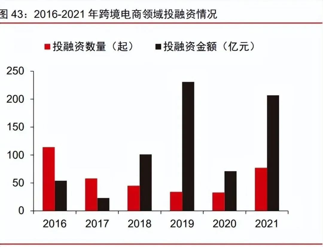服務生態完備,全鏈路賦能跨境賣家。隨著跨境電商行業整體成熟度和專業度的提升, 以及行業競爭的加劇,對賣家的綜合運營能力提出了更高的要求,跨境支付、代運營、營銷推廣等跨境電商服務商應運而生。根據艾瑞咨詢,2021 年跨境電商領域投融資總金額 達 207 億元,其中服務商領域融資事件/規模占比分別為 65%/34.5%。跨境電商服務商生態的繁榮,有助于增強跨境賣家面向海外市場的競爭力。